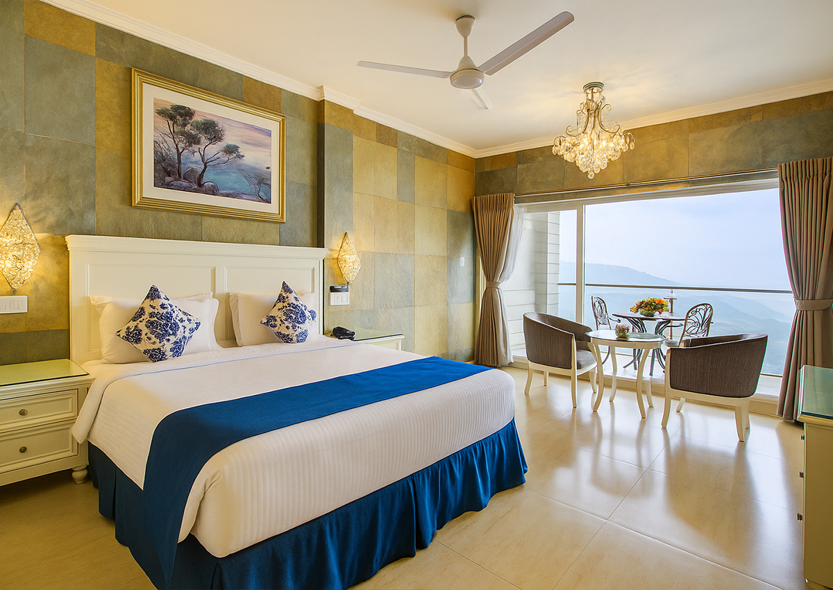If you are looking for luxury hotels with the best views, Hotel Ravine is just the place to be. The Valley side rooms at Ravine are just what you need for a wonderful, relaxed holiday. Tastefully designed, these rooms accommodate 2 persons and are the perfect place to unwind and enjoy a fun filled break. They have a partial view of the beautiful, lush green valley. There is a soft & comfortable spring double bed that ensures a good night's sleep. The area of the rooms is about 250 sq. ft and comes with a balcony that has a spectacular view of the valley and seating for 2 people, making them super spacious. The beautiful decor, elegant furnishing, and modern amenities offer a super luxurious feel, and make the rooms an ideal place to relax.